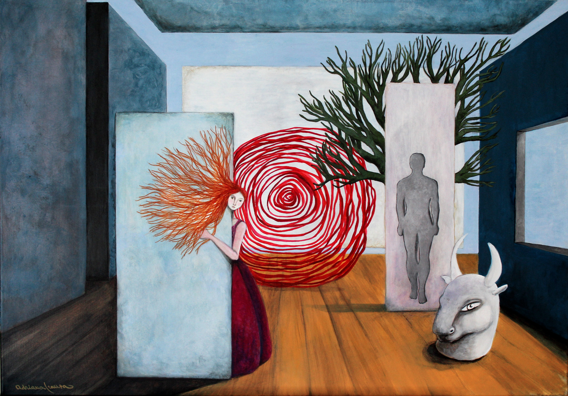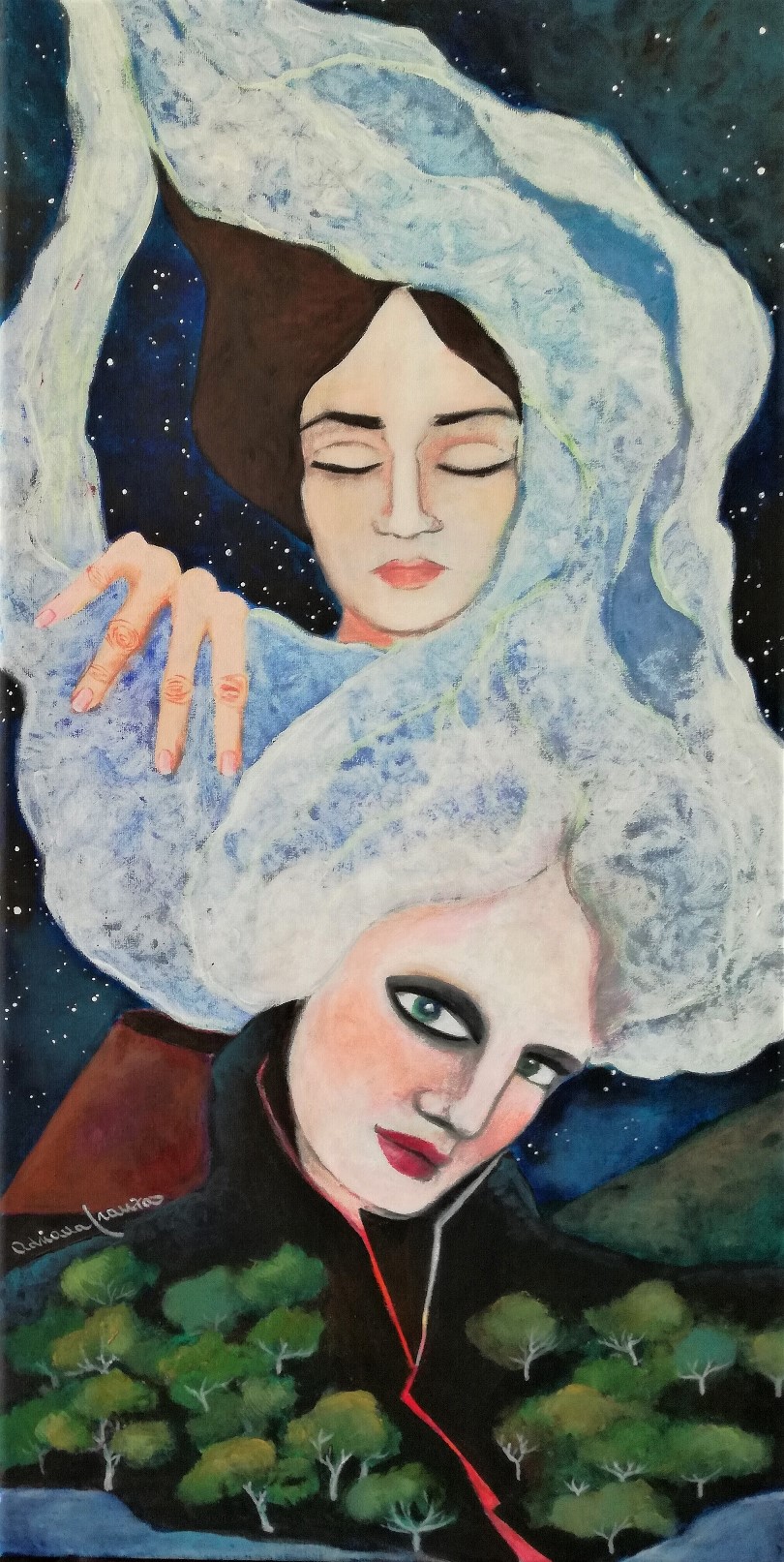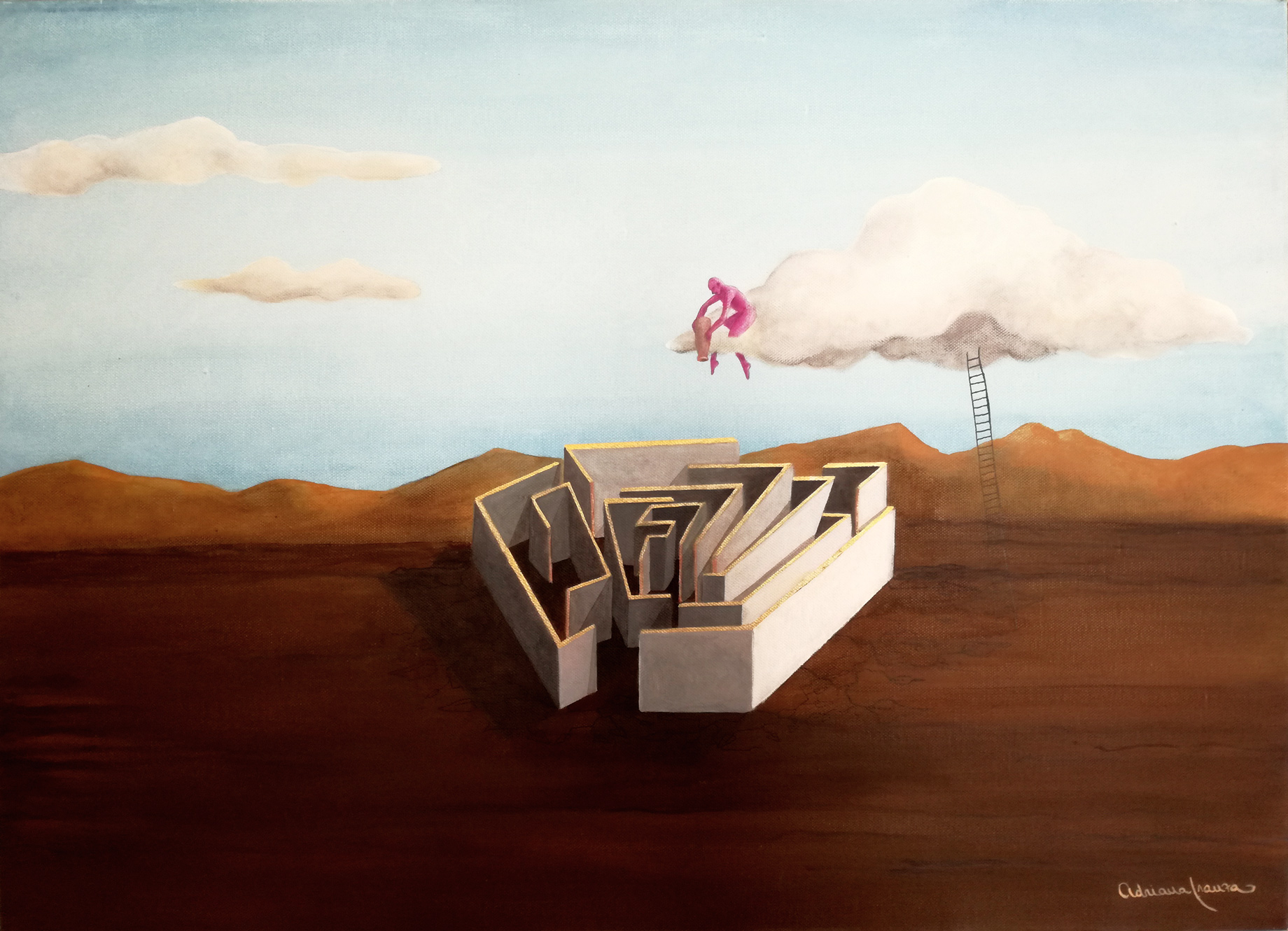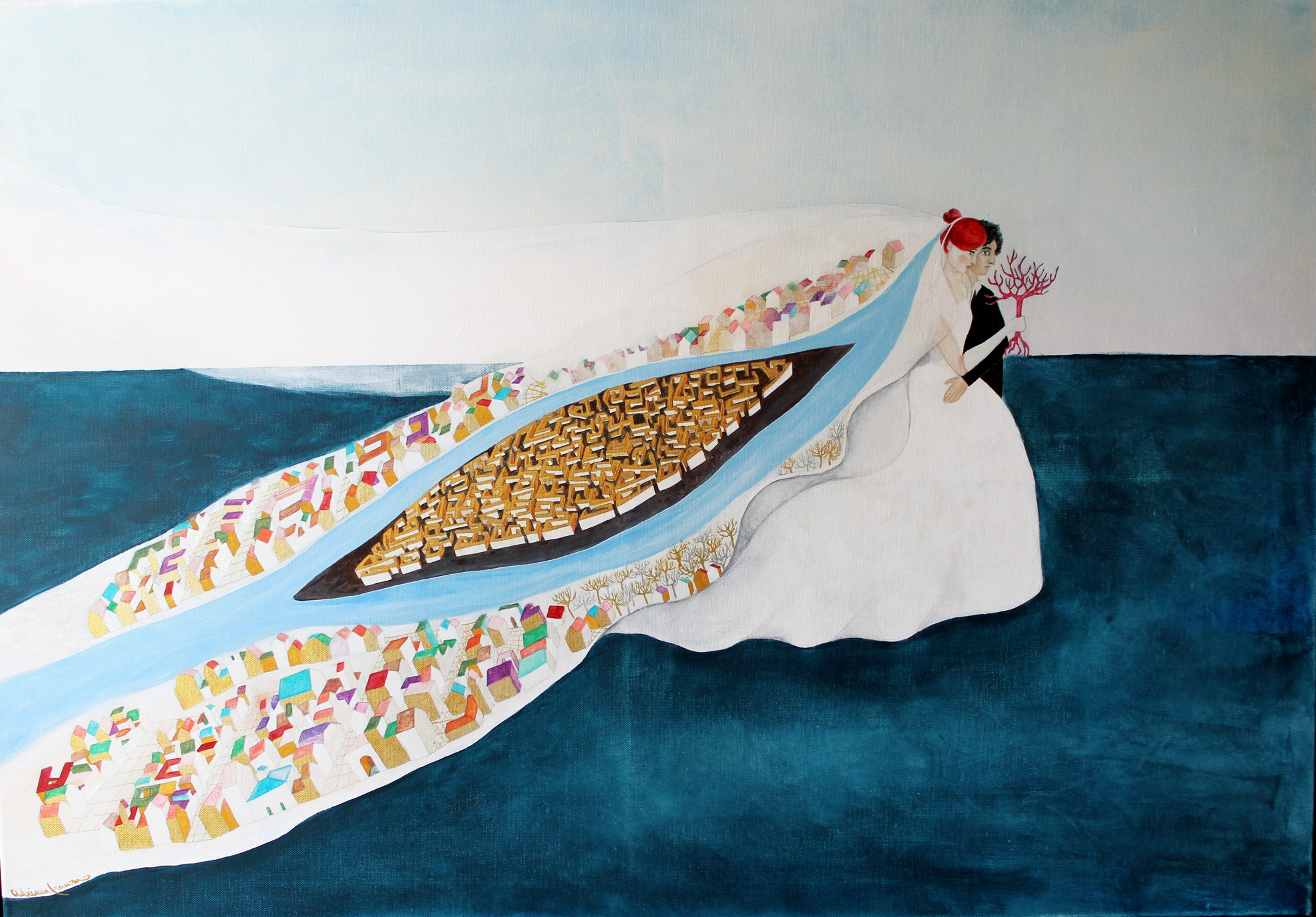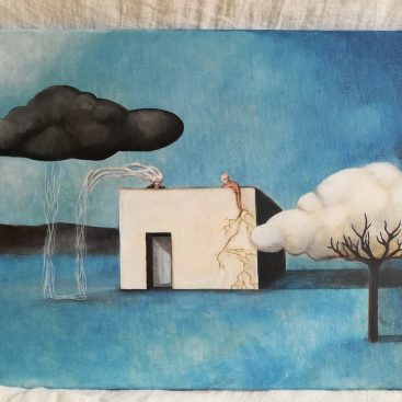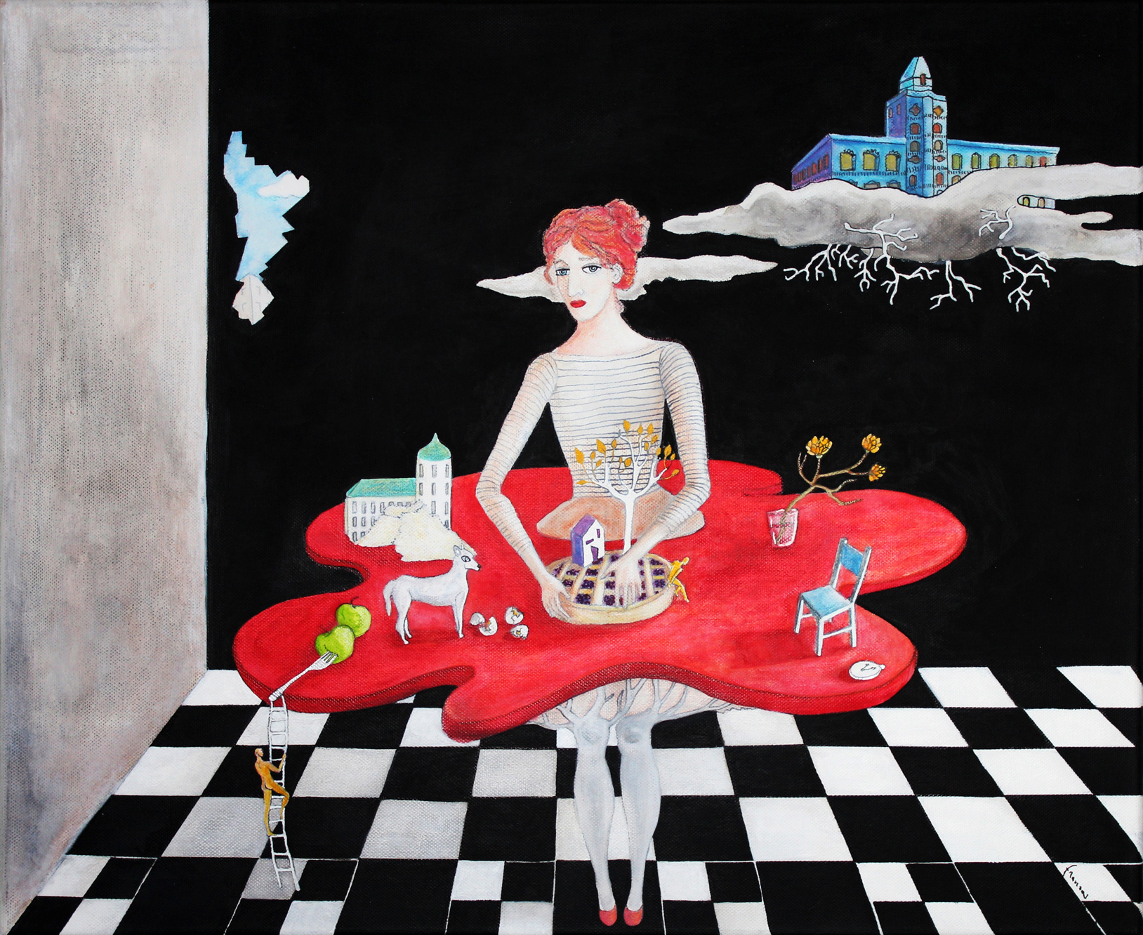 A dreamlike and surreal painting, tries to translate thoughts and moods, to trap nocturnal dreams and memories,  proceeding in parallel with  real life.