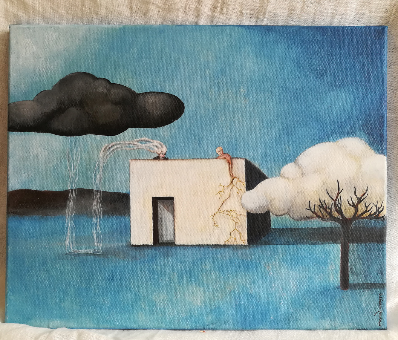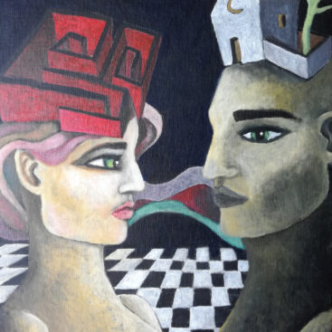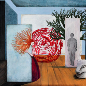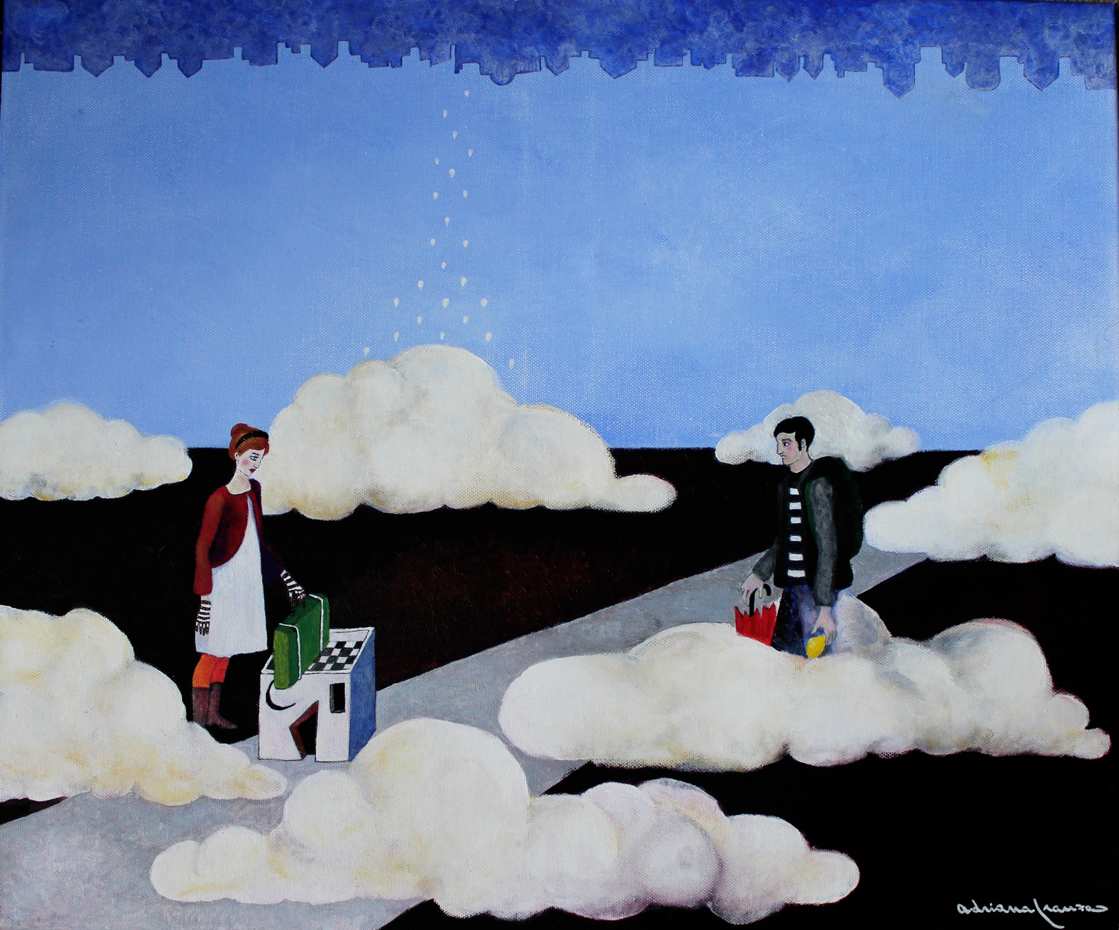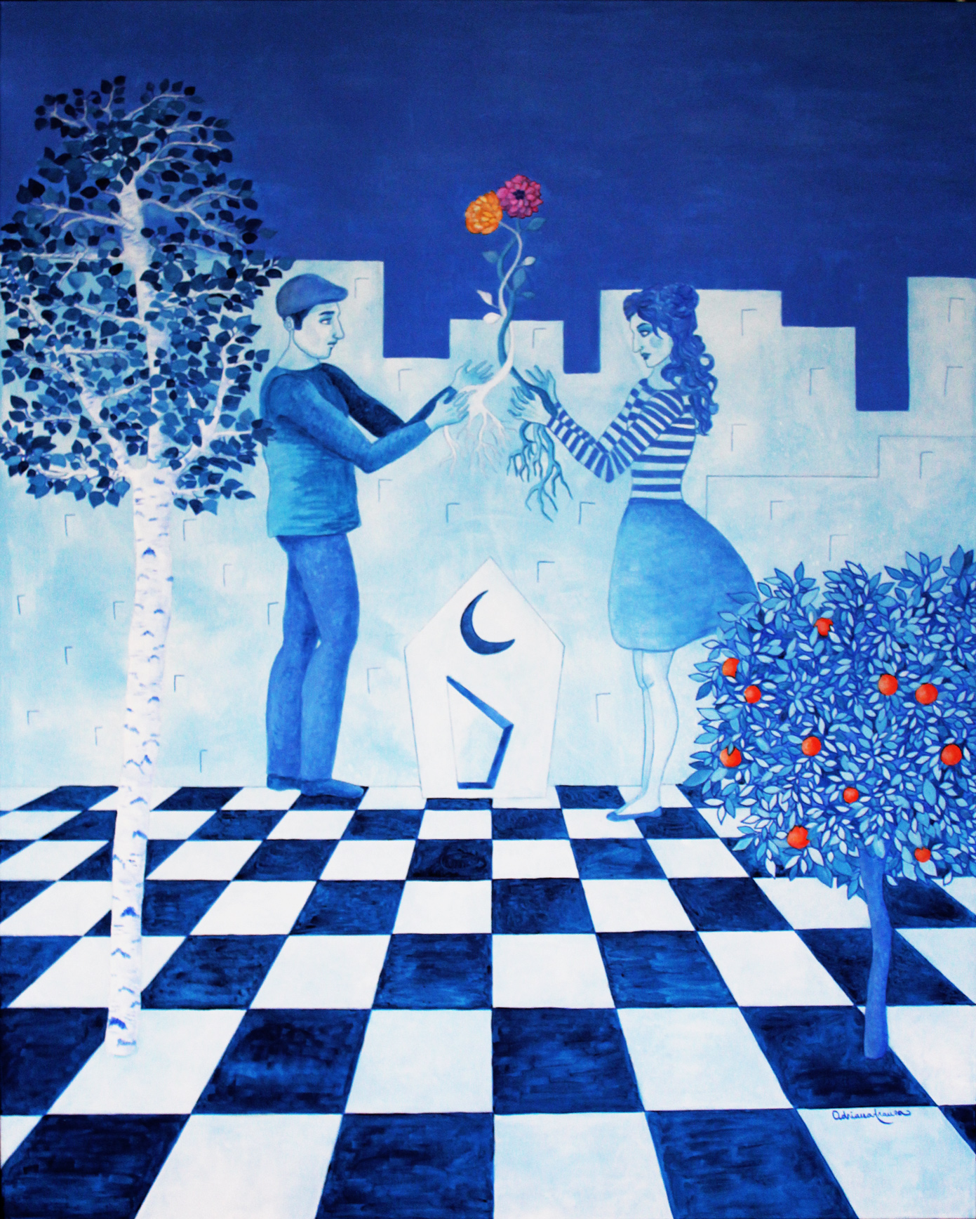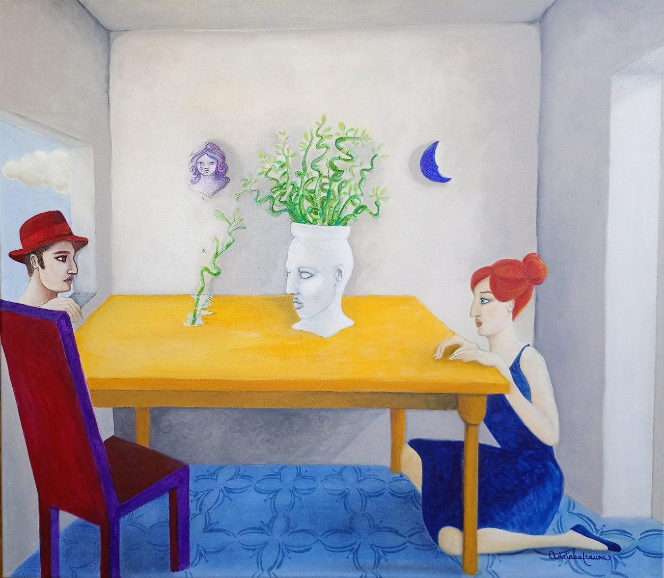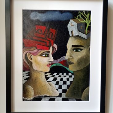 A dreamlike and surreal painting, tries to translate thoughts and moods, to trap nocturnal dreams and memories,  proceeding in parallel with  real life.