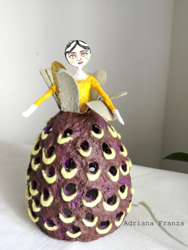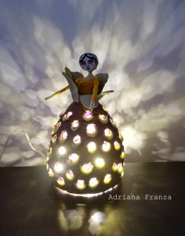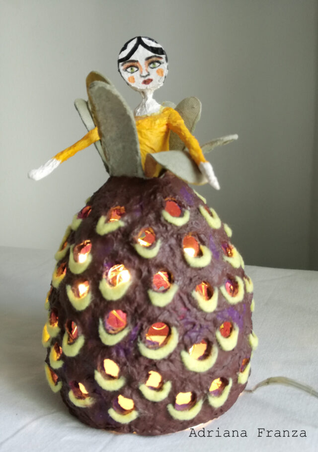 Piccola lampada ornamentale modellata a mano in cartapesta. Illuminata con un filo di luci LED a batteria, è un punto luce versatile che può esaltare e illuminare qualsiasi punto della casa. Altezza 17 cm; diametro 8,5 cm. Prezzo: 50 Euro.