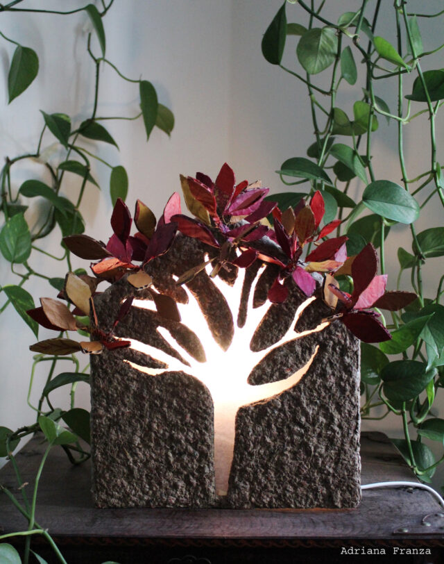 Handmade sculpture lamp in papier-mâché and recycled cardboard. This table lamp has the shape of a house, an engraved tree and autumn colored leaves applied to the roof.