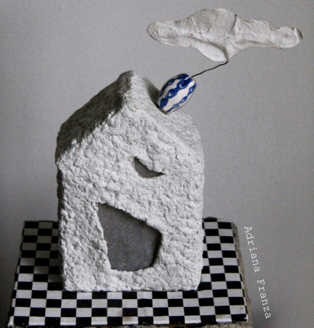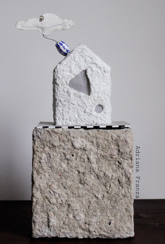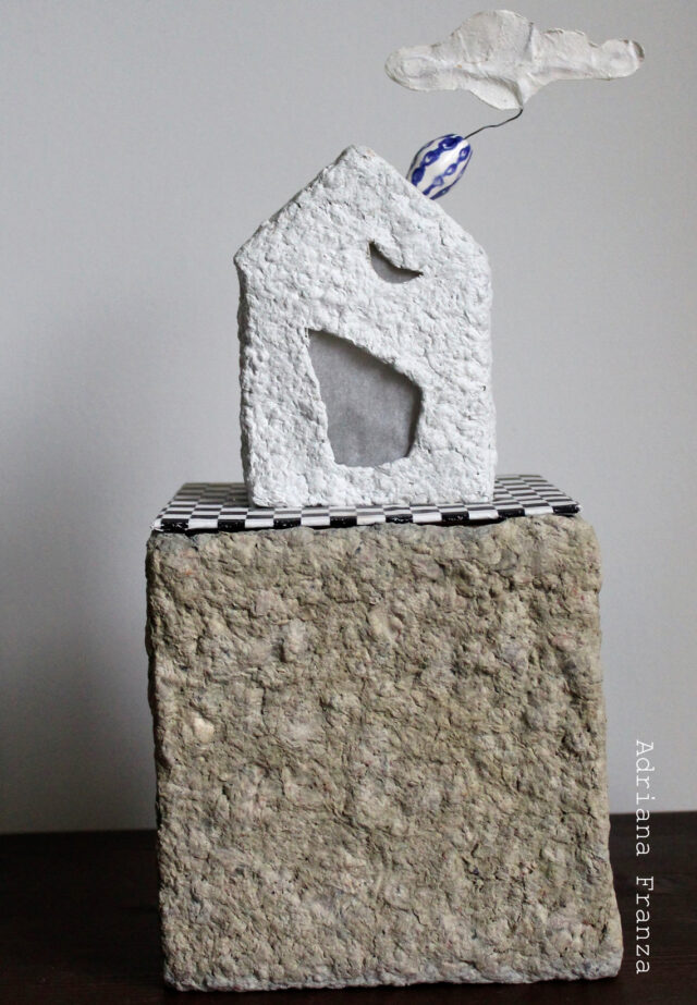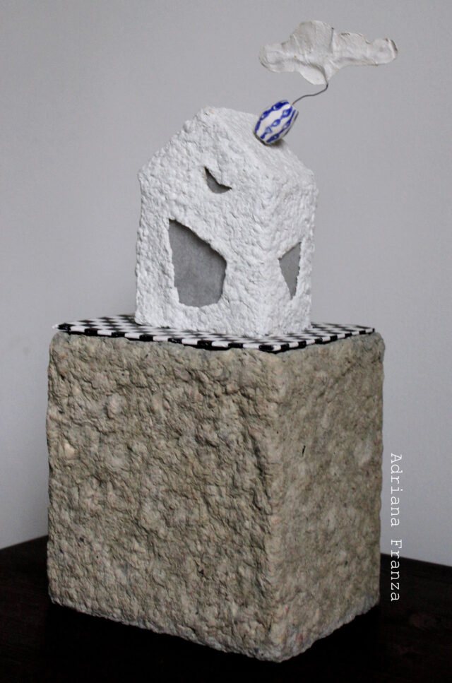 Lampada d'atmosfera modellata a mano in cartapesta, con dettaglio in ceramica.