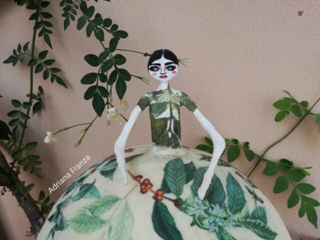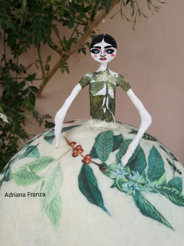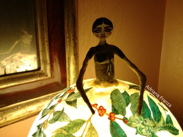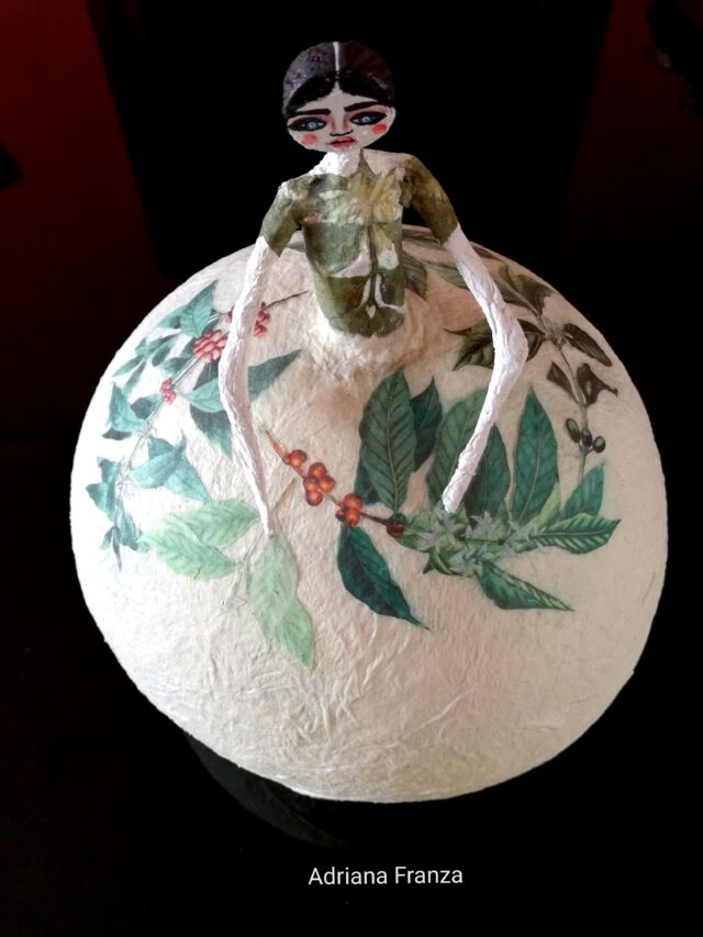 Light, delicate, romantic. Coffee leaves are placed on her dress. Clara is a handmade papier-mache mood lamp. Equipped with lamp holder with cable and switch. Diameter 18 cm; Height: 28 cm.