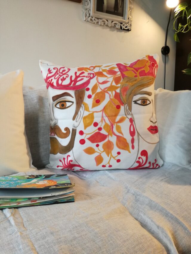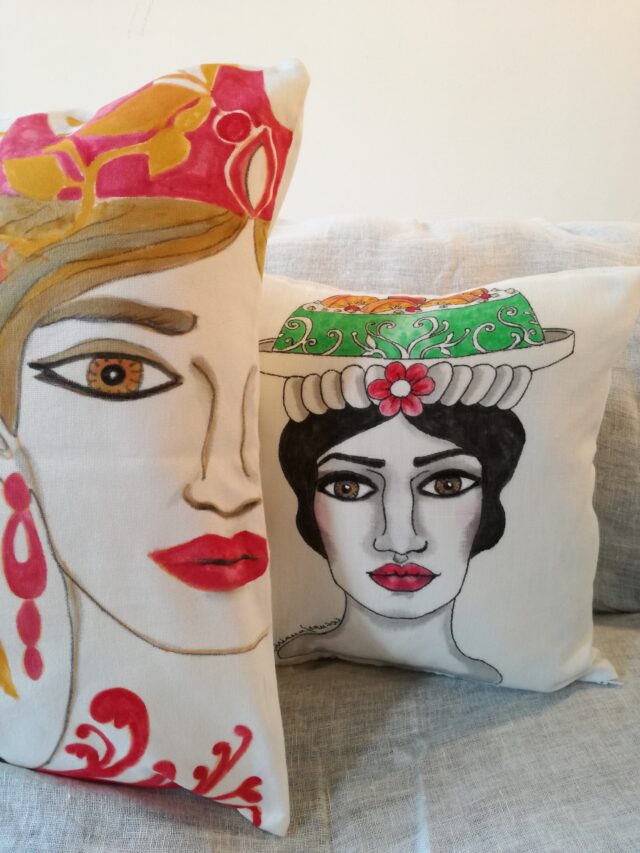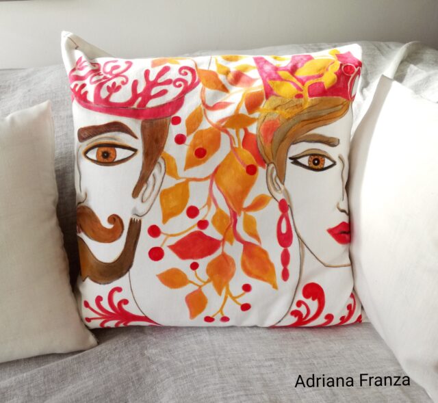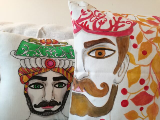 Cuscino grande teste di moro in arancio e ocra Cuscino dipinto a mano, 50x50 cm. Federa in cotone lavabile a mano in acqua fredda. Contattami per acquistare questo cuscino.