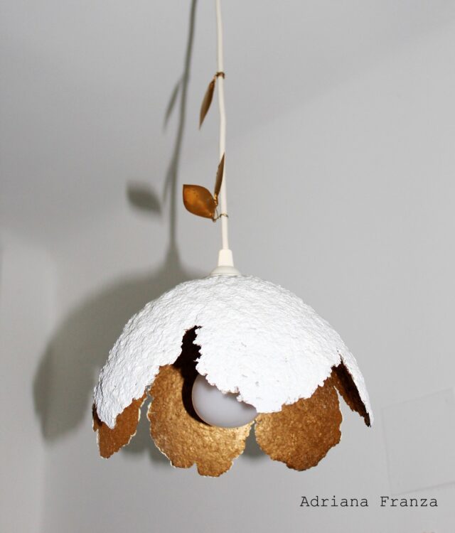 Lampadario a forma di fiore realizzato a mano in cartapesta con finitura interna color oro. Utilizzabile come lampadario da soffitto oppure come lampada da tavolo, sempre in associazione ad una lampadina di tipo LED di attacco E27. Diametro inferiore del fiore: 20 cm. Altezza: 18 cm circa. Prezzo: 70€.