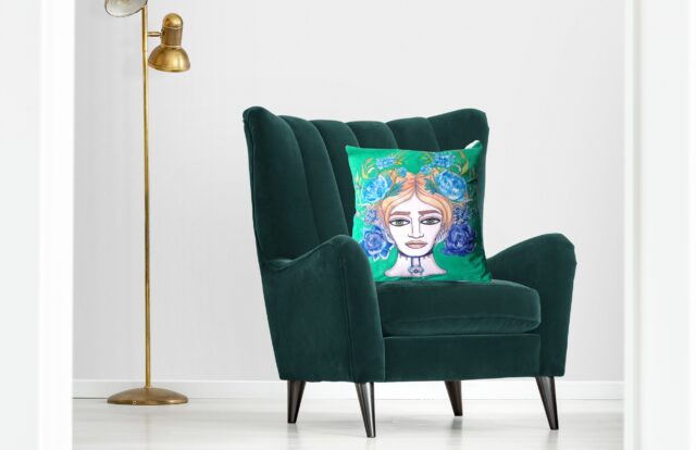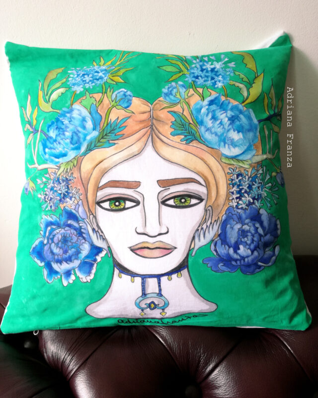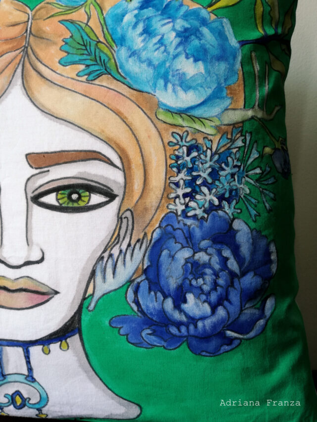 Testa femminile con peonie blu. L'acconciatura e la disposizione simmetrica dei fiori blu evocano il mondo decorativo Liberty, invece i lineamenti della donna ricordano la Sicilia. Colori prevalenti: verde, blu, ocra. Cuscino dipinto a mano, 40x40 cm. Federa in cotone lavabile a mano in acqua fredda. Contattami per acquistare questo cuscino o richiederne una variante personalizzata.