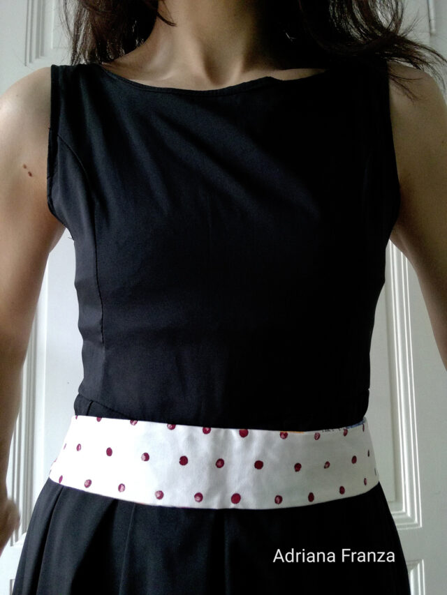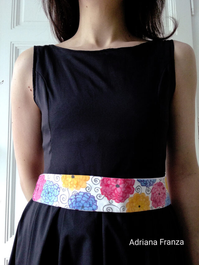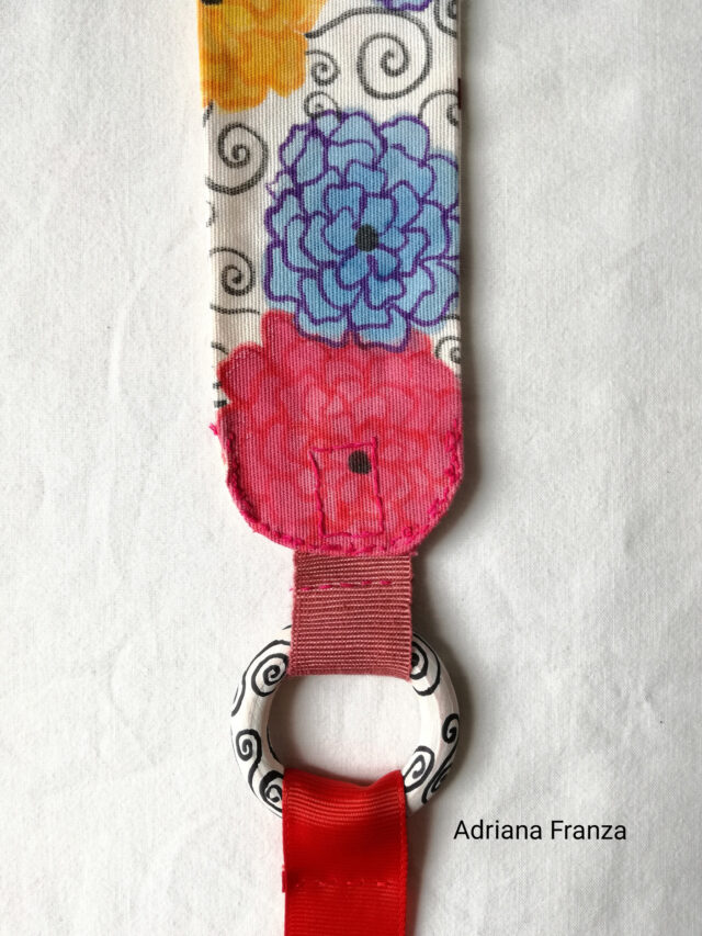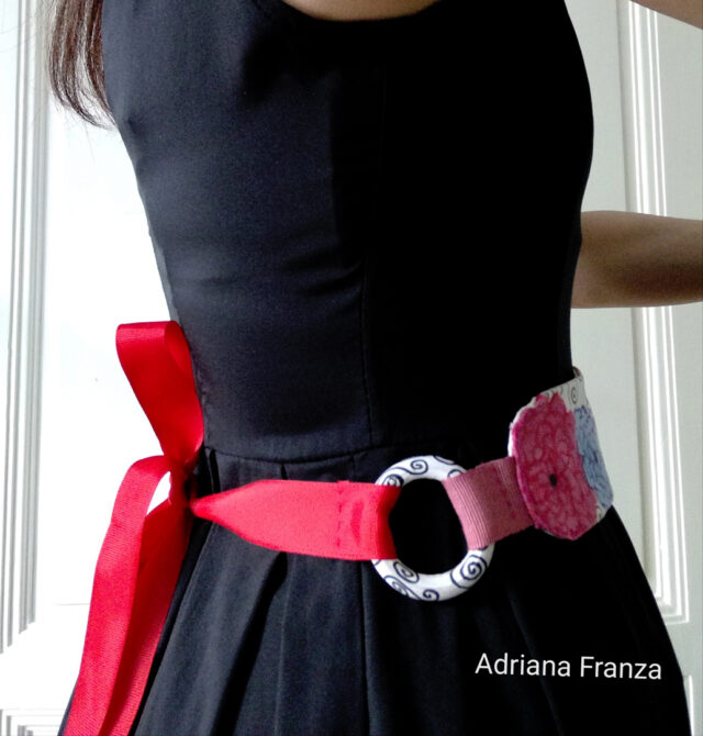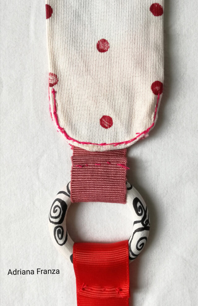 Hand-painted double-face belt in cotton, with painted wood rings and grosgrain ribbon. Dimensions of the cotton band: Height 5.5 cm; Length 43 cm. Overall length 1.74 m. Available now.