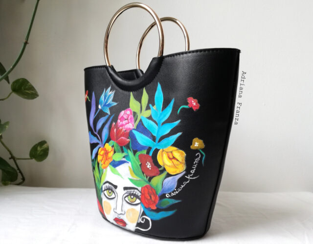 Hand-painted faux-leather bucket. Height (including handles): 29 cm. Upper edge width: 25 cm. Base width: 16 cm. Side thickness 7 cm. Shoulder strap length: 1.10 m. Available now. Price: 125€.