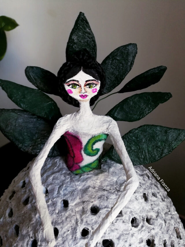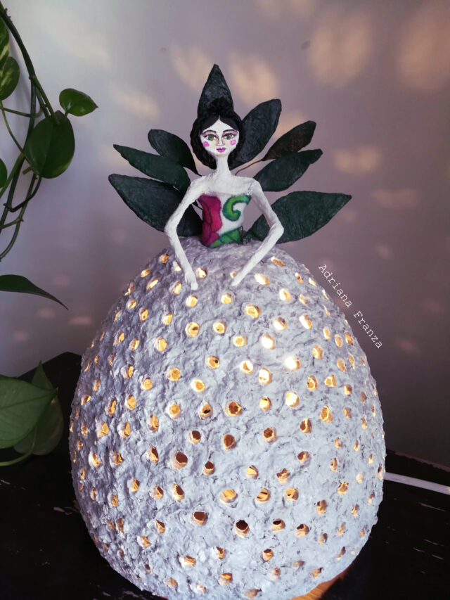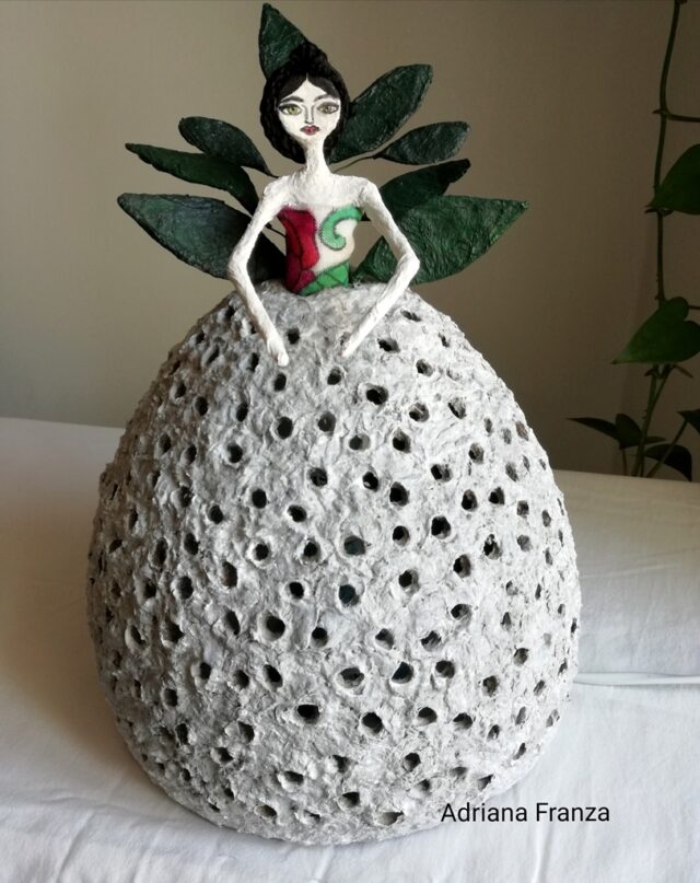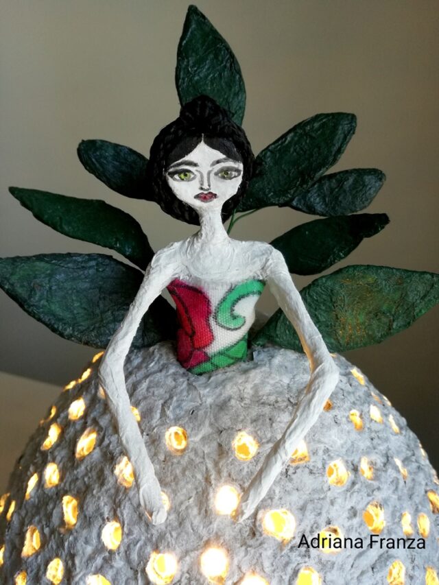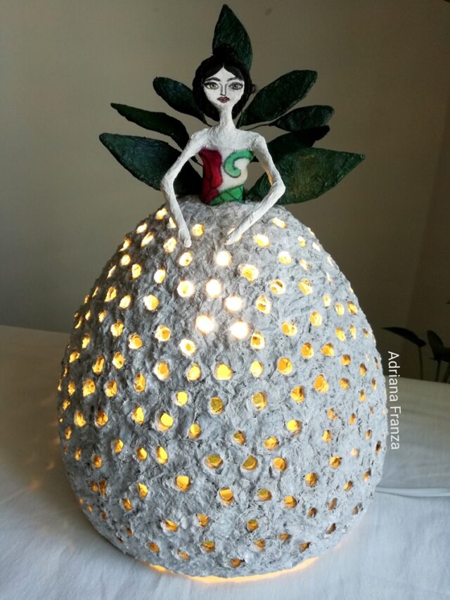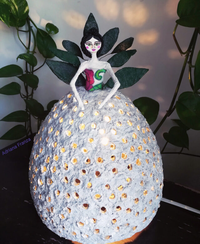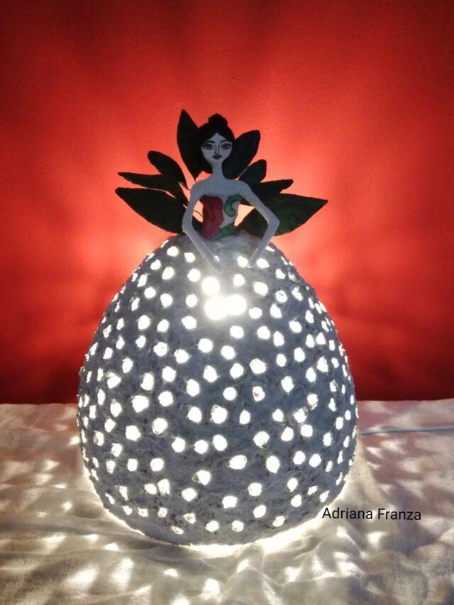 Frida è una “donna di luce” realizzata a partire dalla carta di quotidiani ormai inutilizzati. Una “corona” di foglie di caffè (richiamo all’America Latina) circonda il suo busto, rivestito da stoffa dipinta a mano con un motivo floreale in fucsia e verde. Diametro 20 cm, altezza 29 cm.