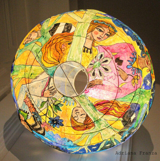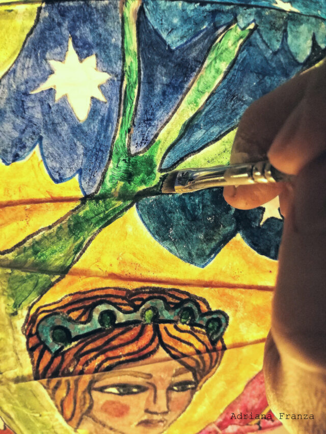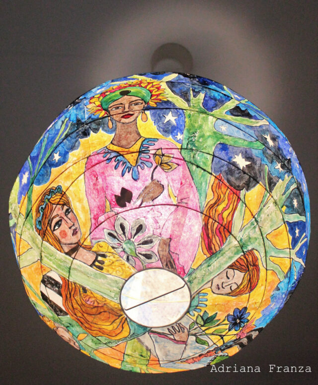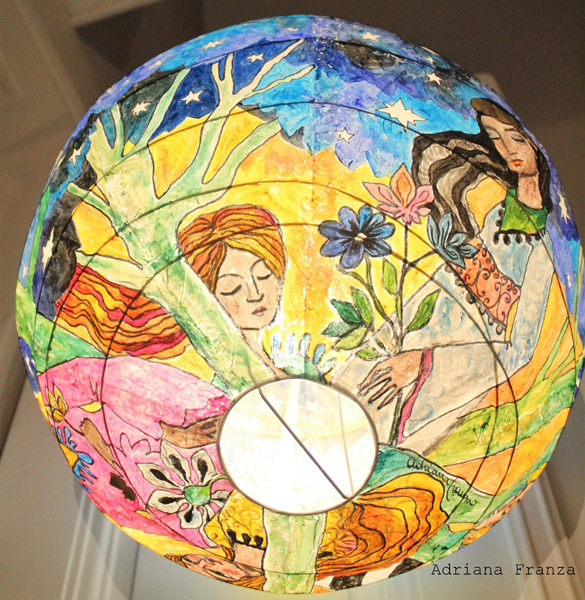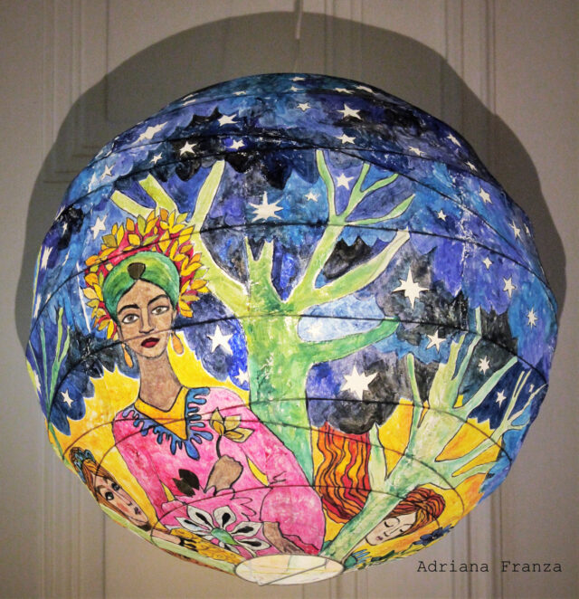 Una regina della notte, creature misteriose e sognanti e alberi blu dalla chioma stellata. Lanterna di carta dipinta a mano, 45 cm di diametro. Prezzo: 200€