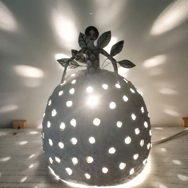 Leaves painted with black brushstrokes embellish her perforated white dress from which the light comes out. The bust is painted with black and white graphic motifs. Handmade in papier-mâché, it is equipped with a lamp holder with cable and switch, suitable for hosting a small LED bulb (E14). Height 27 cm; Diameter 20 cm.
