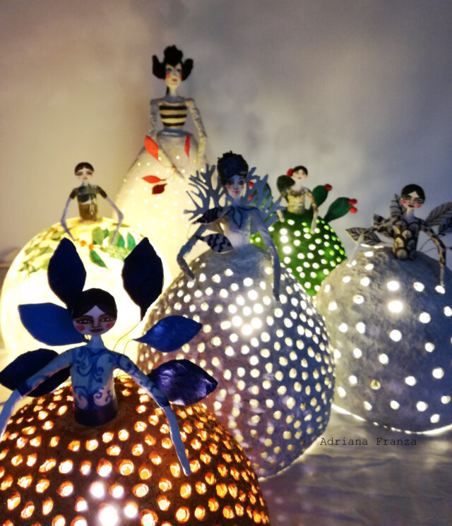 Malacala takes its name from a Sicilian sea place. Its fragrant rocks, the clean and fresh water with its iridescent reflections, its mysterious seabed, were the inspiration for this “Light-Woman”. This lamp is handmade in papier-mâché. Height 32 cm; Base diameter 19 cm. Malacala is equipped with a lamp holder with switch and cable, to always be used with LED bulbs.