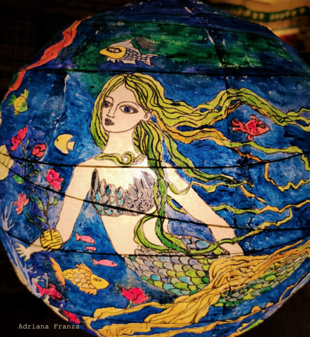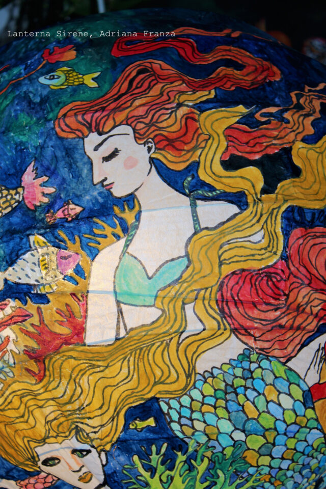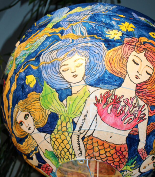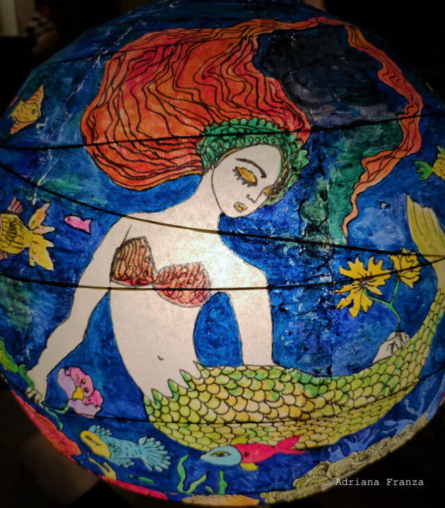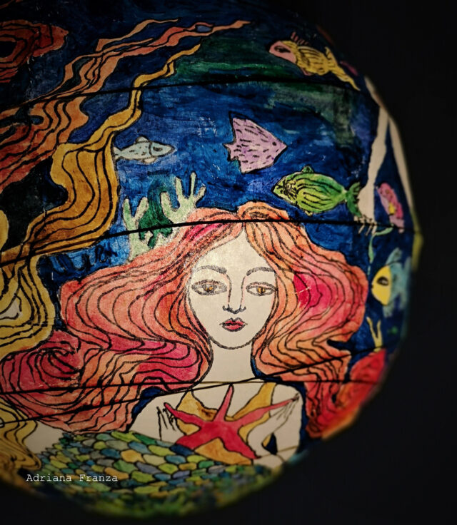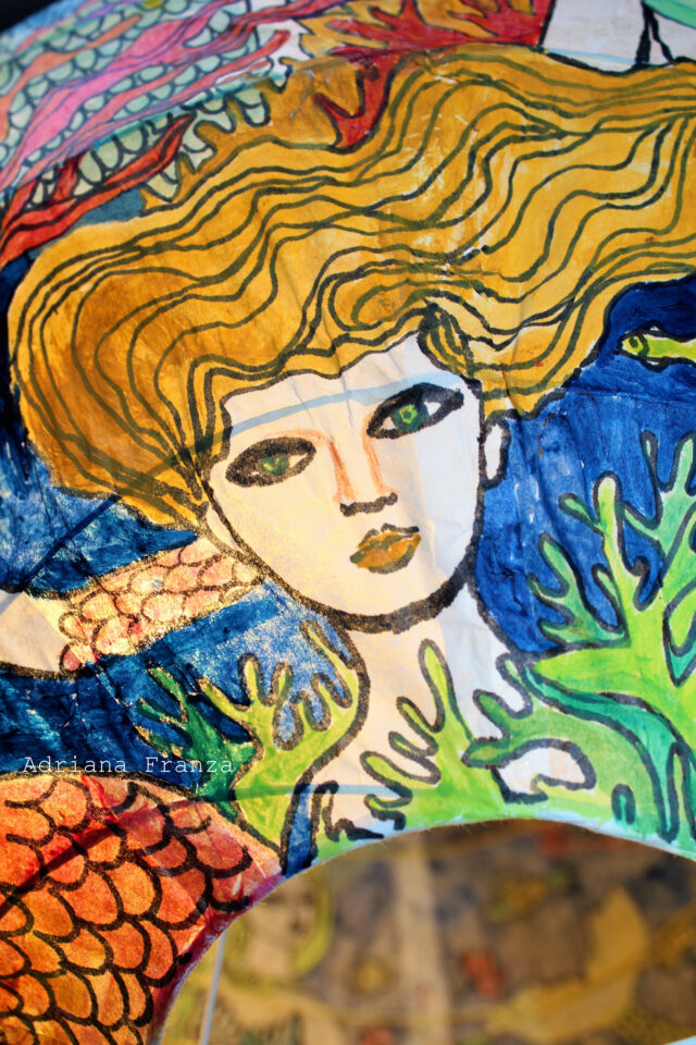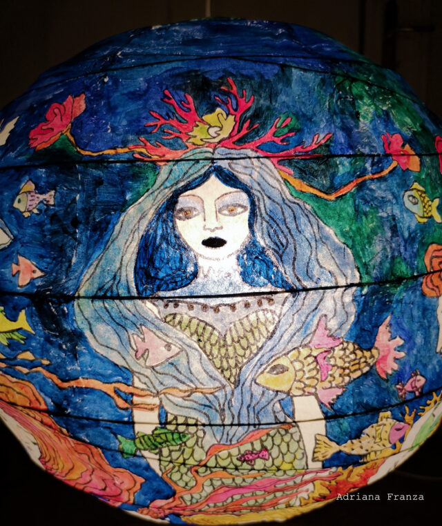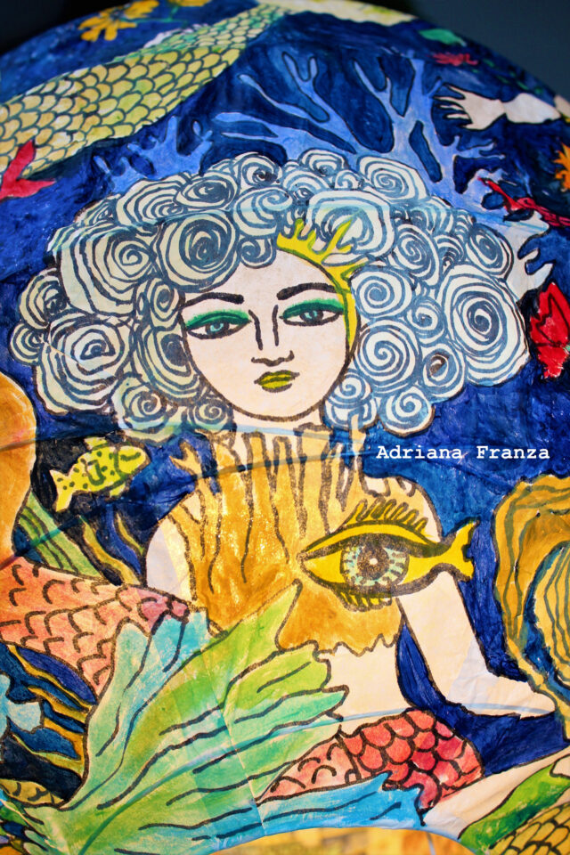 Deep in an imaginary sea, between waves of multicolored hair, the mermaids spread colorful glows around this lantern. Hand painted chandelier, paper, diameter 45 cm.