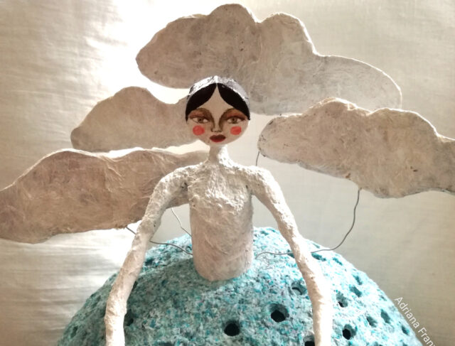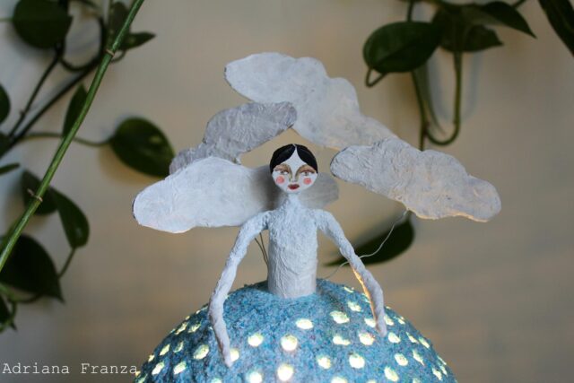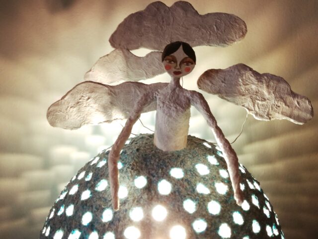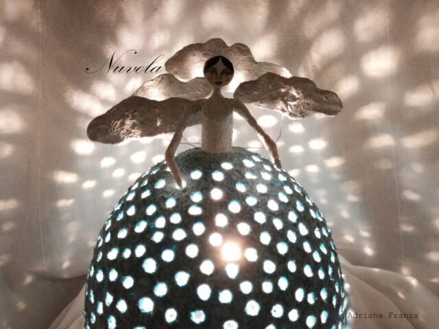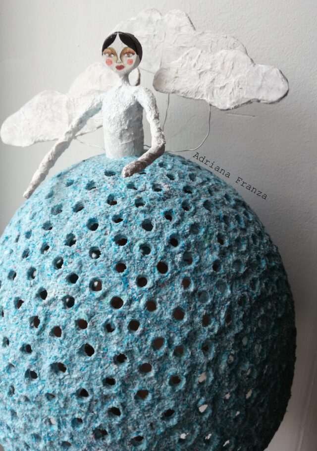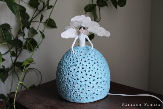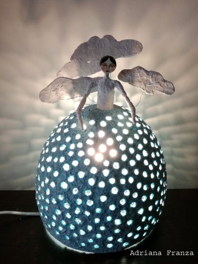Una lampada romantica e delicata, ispirata al cielo primaverile. Realizzata in cartapesta a partire da scarti di documenti, è punteggiata da una fitta trama di fori che diffondono e rifrangono attorno a sè una luce azzurra e cristallina. Diametro inferiore di 18 cm; altezza di circa 27 cm.