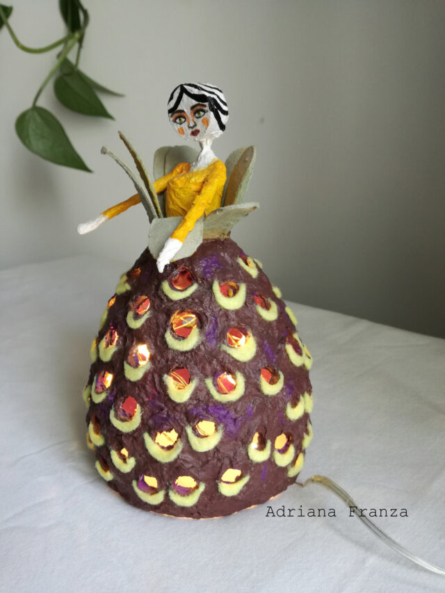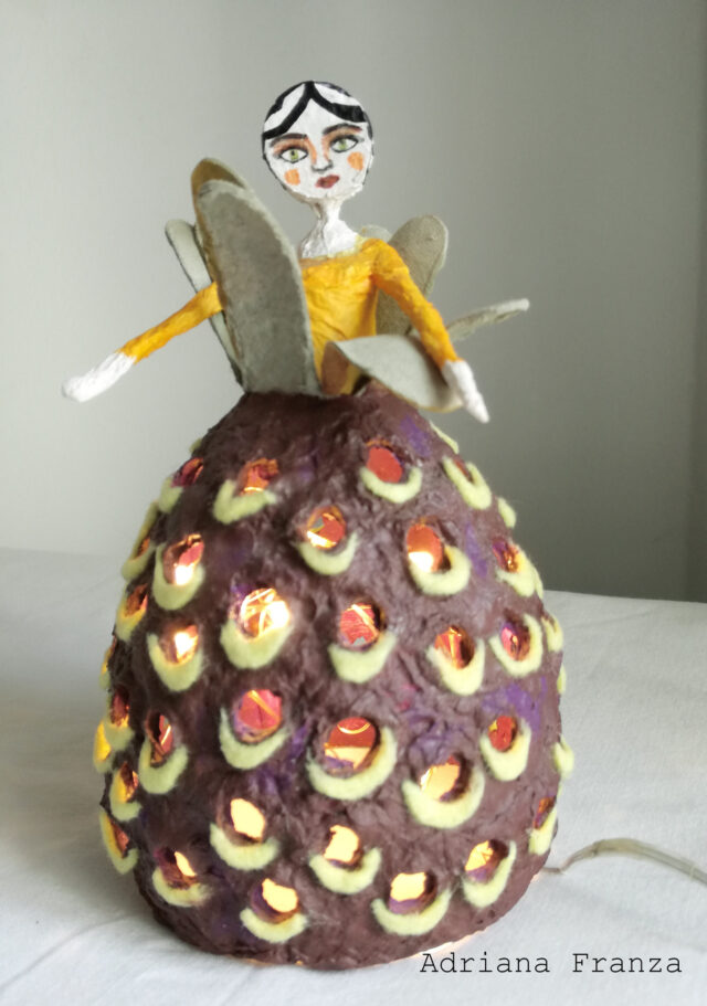 Small hand-molded ornamental lamp in papier-mâché. Illuminated with a string of battery-powered LED lights, it is a versatile lamp that can enhance and illuminate any point in the house. Height: 17 cm; diameter: 8,5 cm. Price: 50€
