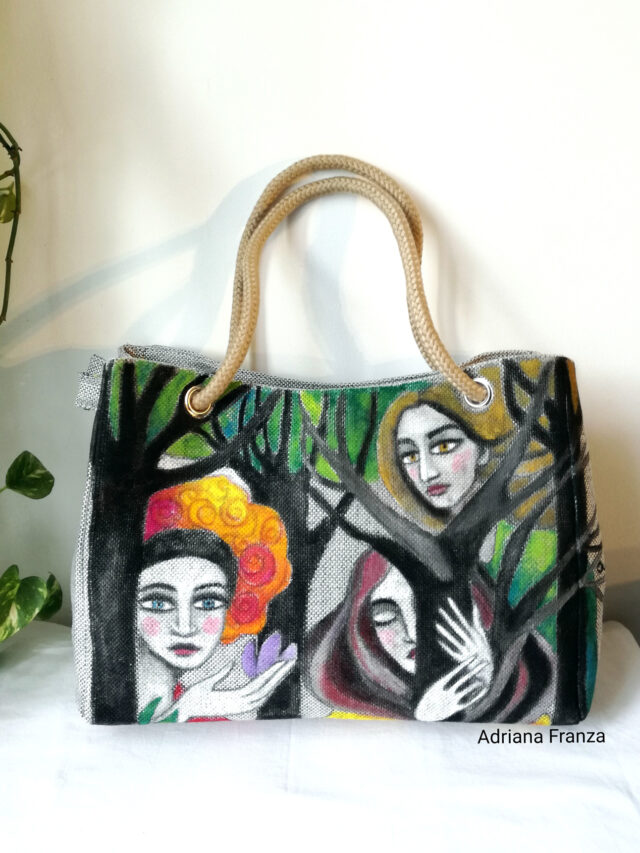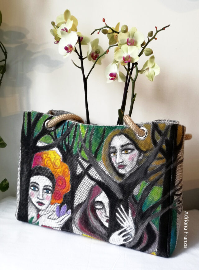 Borsa shopper in robusta tela di cotone, dall'aspetto simile ad un quadro. Il motivo dipinto, con alberi e visi femminili, fiorisce sulla base grigia e neutra della borsa. Dimensioni: 42 x 27,5 cm. Spessore 17,5 cm.
