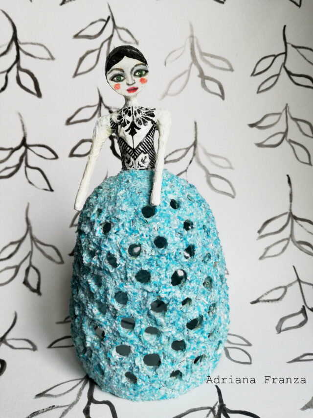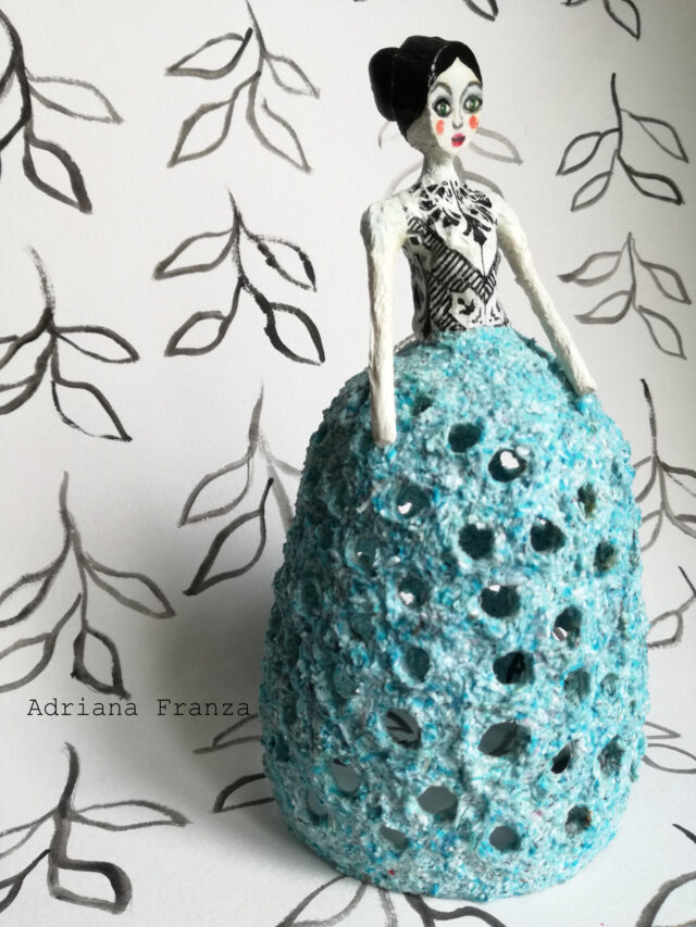 Piccola lampada ornamentale modellata a mano in cartapesta. Illuminata con un filo di luci LED a batteria, è un punto luce versatile che può esaltare e illuminare qualsiasi punto della casa. Altezza 17,2 cm; diametro 8,5 cm. Prezzo: 60€