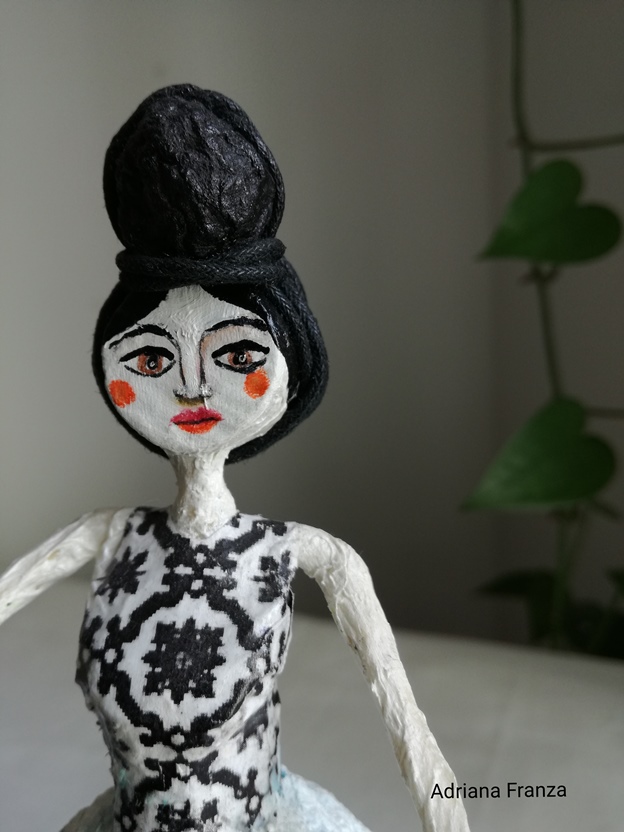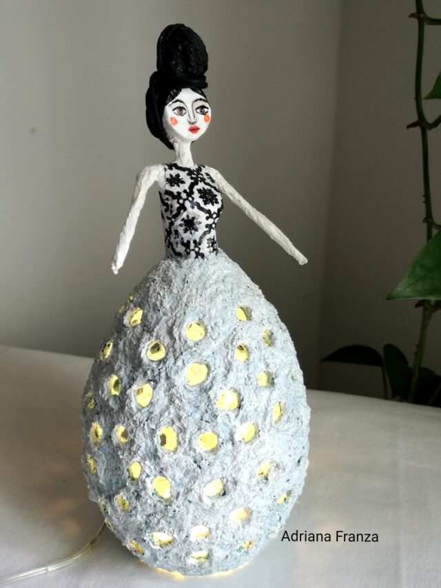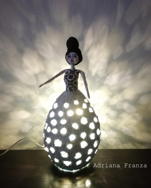 Piccola lampada ornamentale modellata a mano in cartapesta. Illuminata con un filo di luci LED a batteria, è un punto luce versatile che può esaltare e illuminare qualsiasi punto della casa. Altezza: 25 cm; diametro massimo: 9 cm. Prezzo: 60€