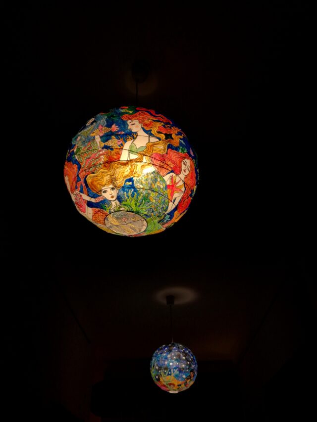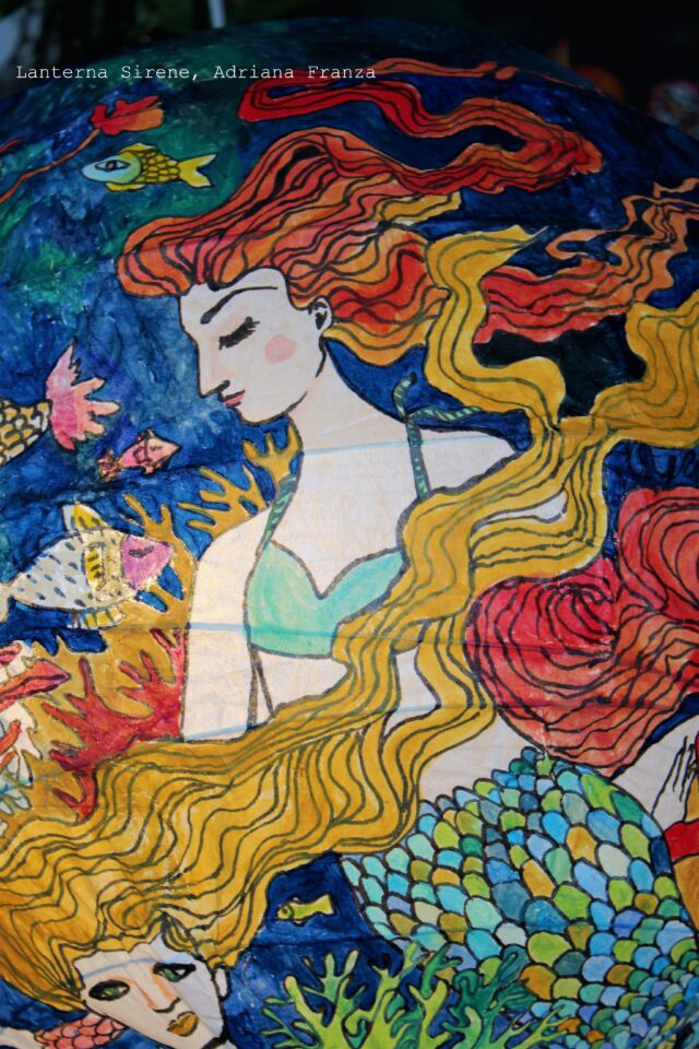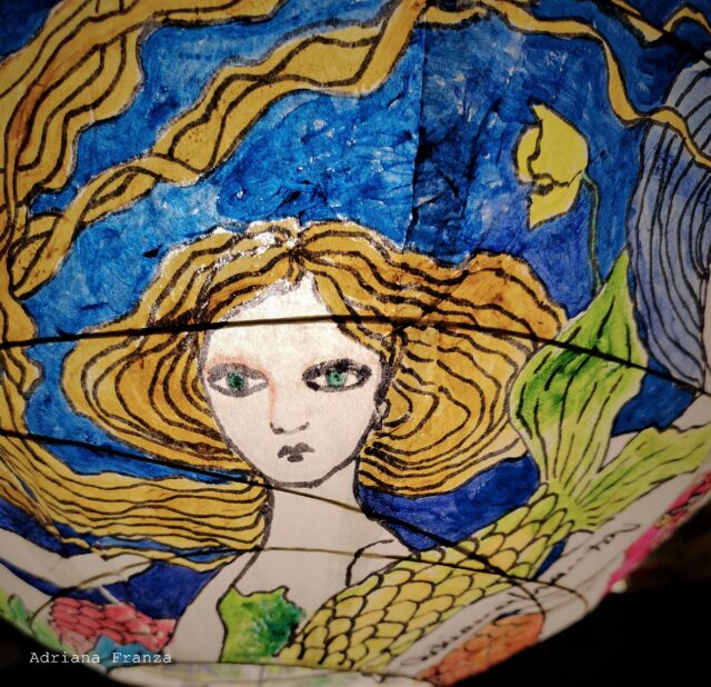 Nel profondo di un mare immaginario, tra onde di capelli multicolore, le sirene diffondono bagliori colorati intorno a questa lanterna. Lampadario dipinto a mano, carta, diametro 45 cm. 200 €.
