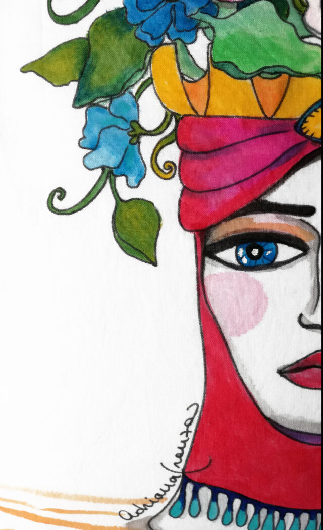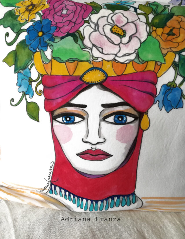 Testa femminile (Testa di moro a colori) - Cuscino dipinto a mano, 40x40 cm. Federa in cotone lavabile a mano in acqua fredda.