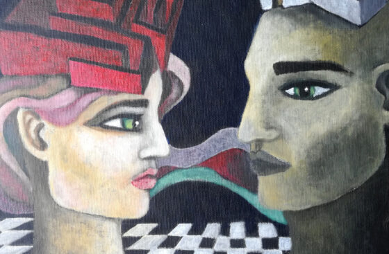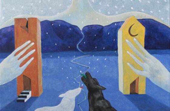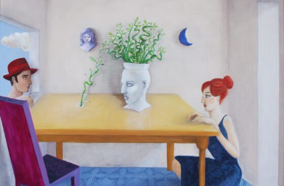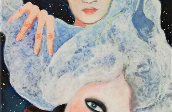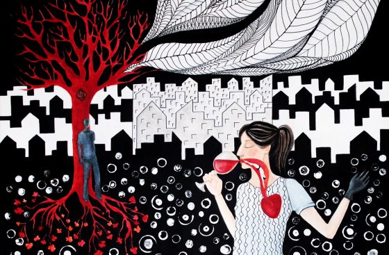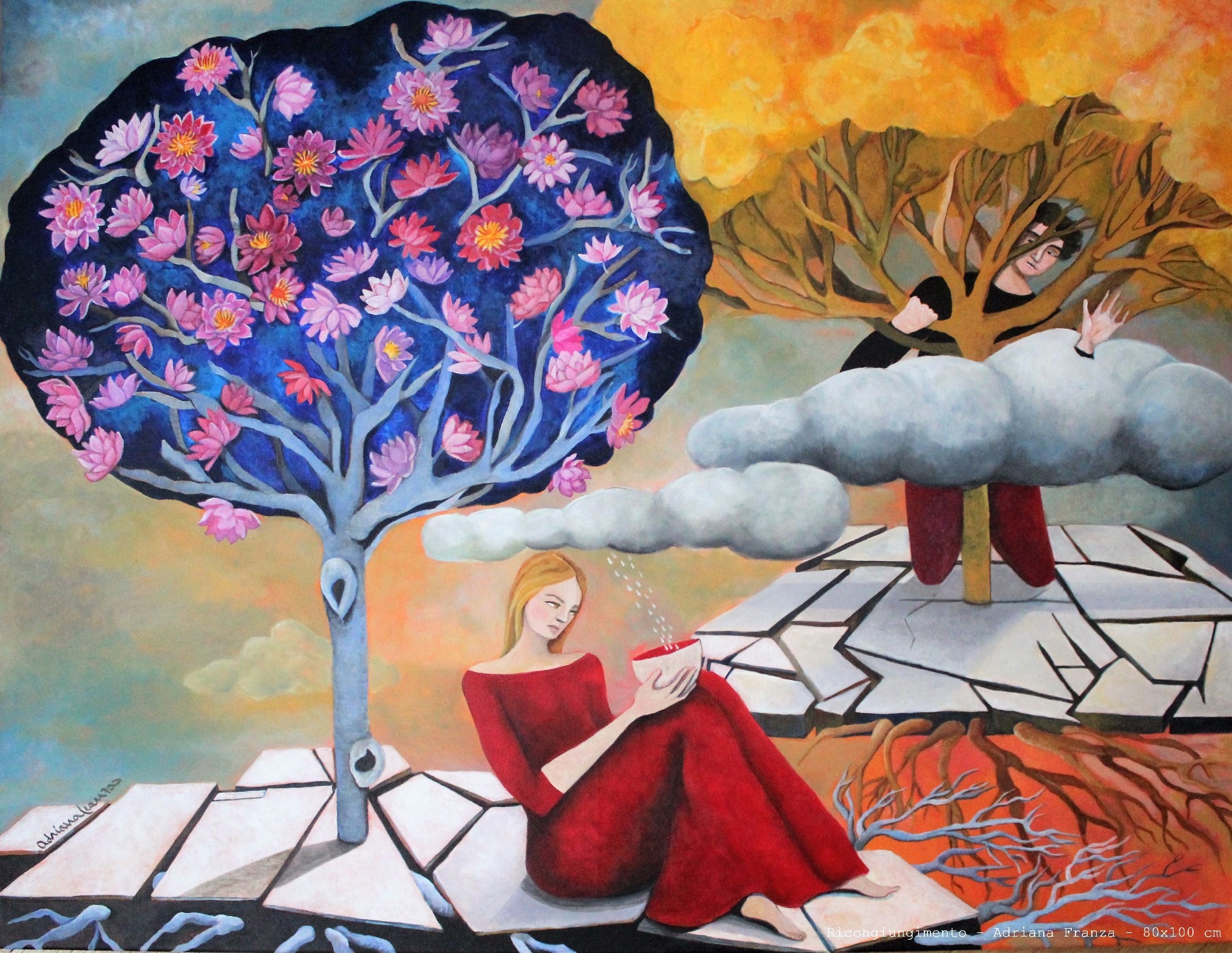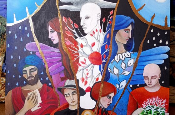 Tree of life-Sun and moon /Acrylic and embroidery thread on jute, 65×85 cm