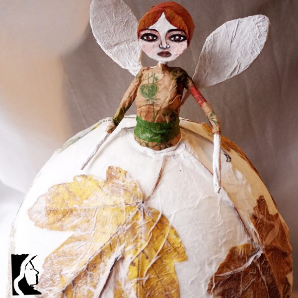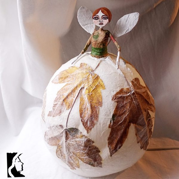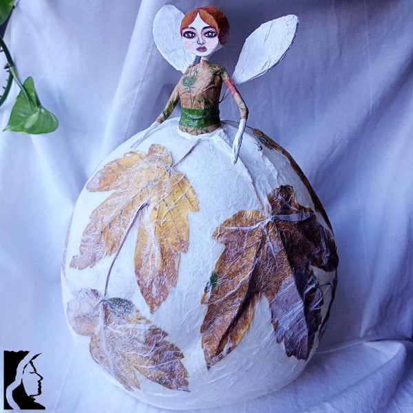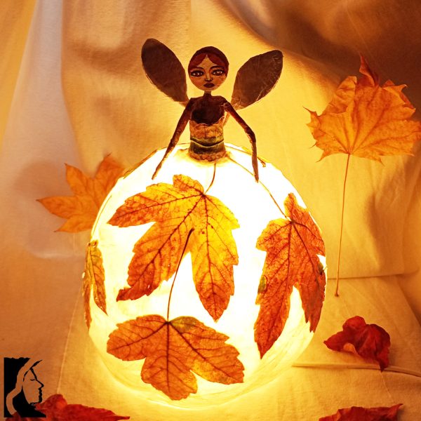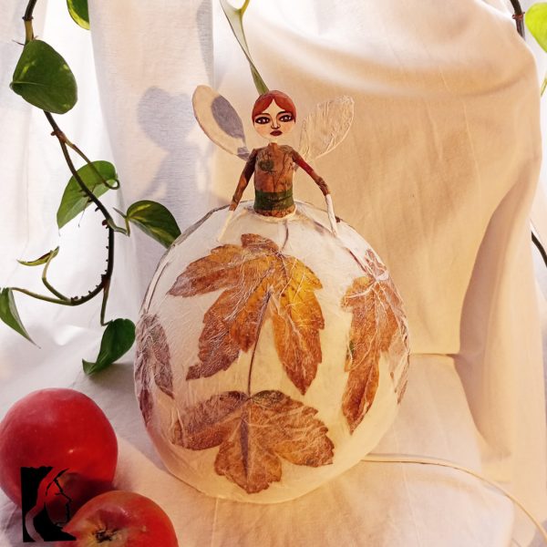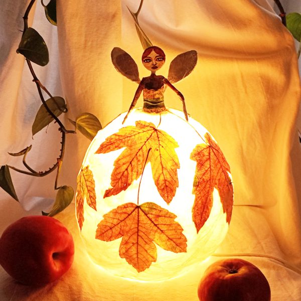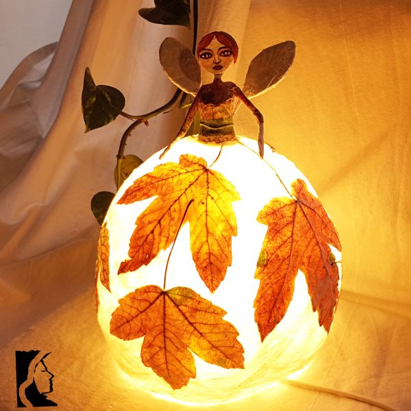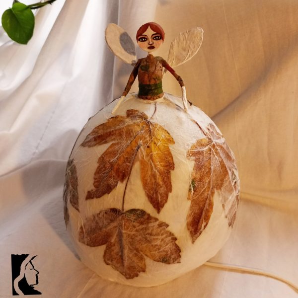 Poetica e delicata, questa lampada da tavolo diffonde un aluce calda e dorata dal suo paralume a forma di gonna, fatto di strati di carta e foglie autunnali.