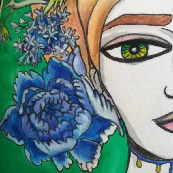 Il viso femminile protagonista è acconciato con peonie e plumbago.