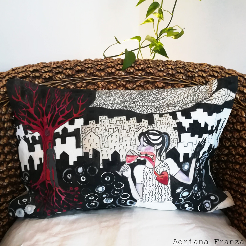 “Fiori blu” è un cuscino dipinto a mano, nelle nuances del blu e del verde.
