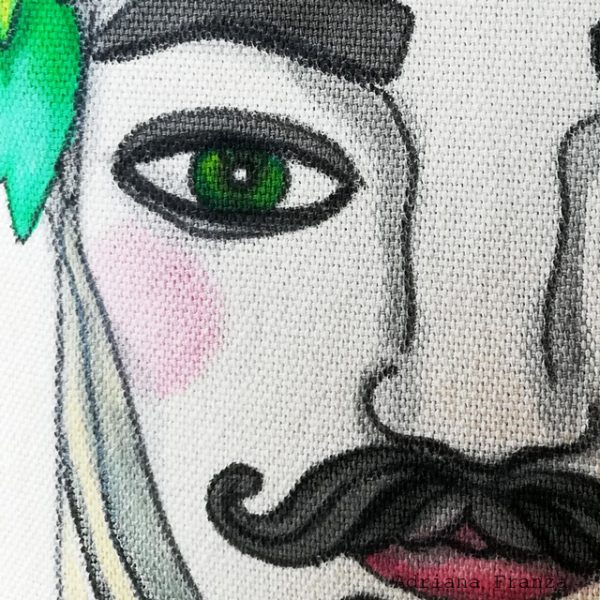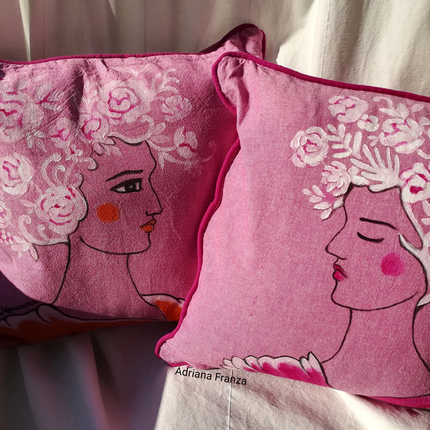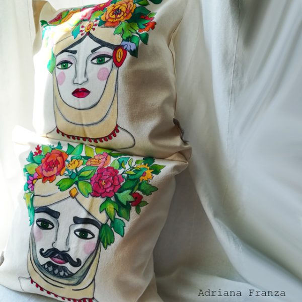Couple of hand-painted pillowcases with reinterpretation of a typical theme of Sicilian ceramic art  (the traditional vases called “Moor’s heads”).